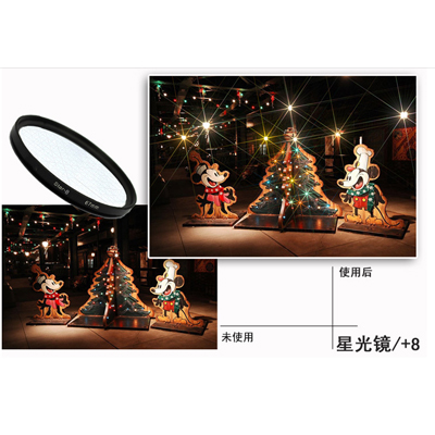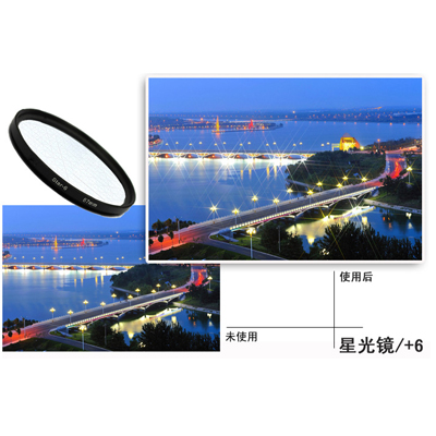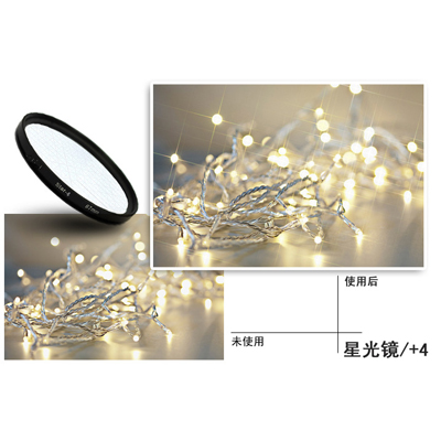 星光镜根据其上雕刻的细线数目和细线构成的图案不同,会产生不同效果的星状闪光。常见的星光镜主要有:十字镜、雪花镜和米字镜。在拍摄珠宝、水面、星光、灯光等场景时,可以得到不同类型的光芒。